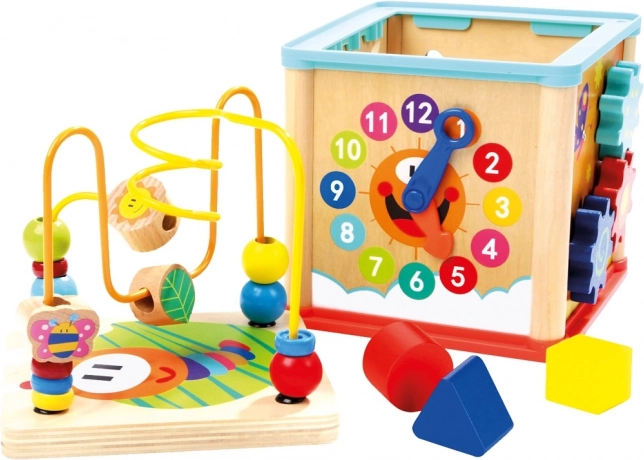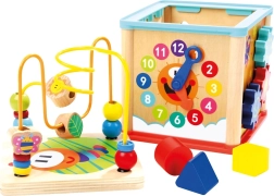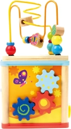 Denne farverige motoriske træ-kube tilbyder børn fra 12 måneder mange måder at lege og samtidig lære på. Med uret og visere lærer børn på en legende måde om tid, perlelaboratoriet udvikler greb og koordination, og de øvrige sider træner logik, former og farver.