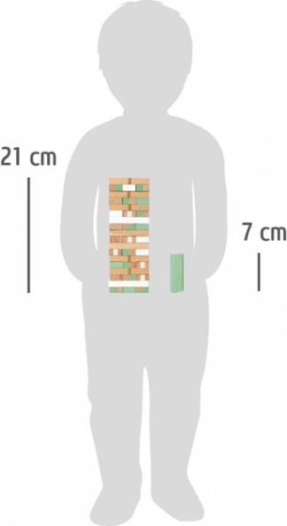 Spillet kan spilles af børn fra 3 år og kan tilpasses spillernes alder og niveau – spil klassisk, eller tilføj den træterning, der giver nye udfordringer. 2-i-1-emballagen gør det desuden nemt at bygge og opbevare klodserne sikkert.