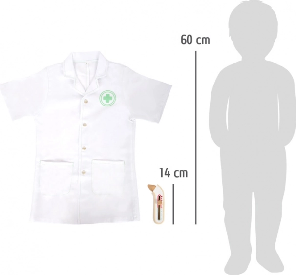 Small foot lægesættet til børn indeholder alt, hvad små læger behøver til deres første klinik. Kittel i størrelse 110 passer til børn med en højde på 105–110 cm og er let at tage af og på takket være trykknapper. Træredskaberne ligger behageligt i hånden, er holdbare og sikre til børns leg.