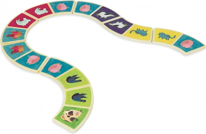 Berig dine børns leg med dette originale dominospil med et smukt bondegårdsmotiv fra Vilac. Takket være den buede form er domino-brikkerne ikke kun unikke, men også lette at gribe for små hænder. Sættet indeholder i alt 28 træbrikker, som giver timevis af underholdning. Domino styrker opmærksomhed, finmotorik og logisk tænkning.