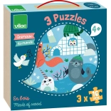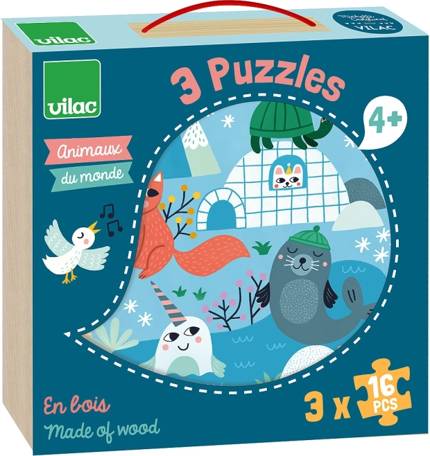Tre billedpuslespil med motiver af savannen, skoven og isflagerne introducerer børn til dyrenes verden i deres naturlige miljø.
