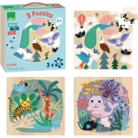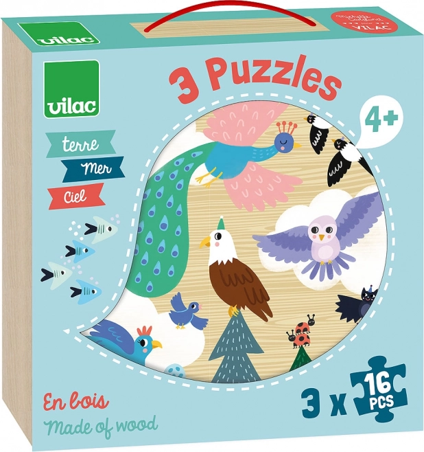 Oplev naturens vidunderlige verden gennem dette sæt træpuslespil. Hvert af de tre billeder viser et forskelligt tema: leg blandt skyerne, den undersøiske verden og eventyr i junglen. Scenen på himlen glæder med en smuk påfugl, en ørn og andre fugle. Havmotiverne vækkes til live af en stor hval, en blæksprutte og venlige fisk. Land-scenen omfatter en tiger, en krokodille og en papegøje i et lyst og muntert junglemiljø.