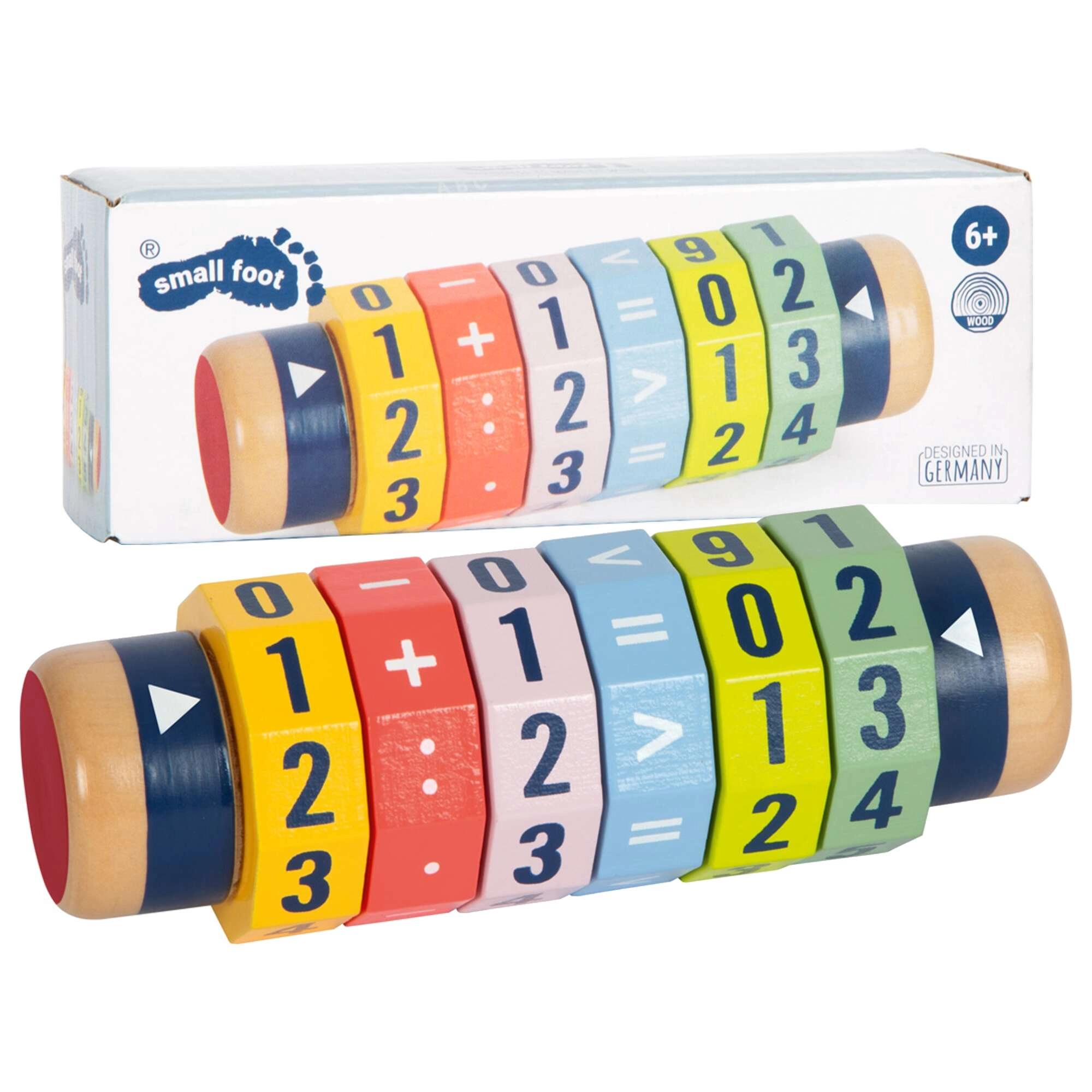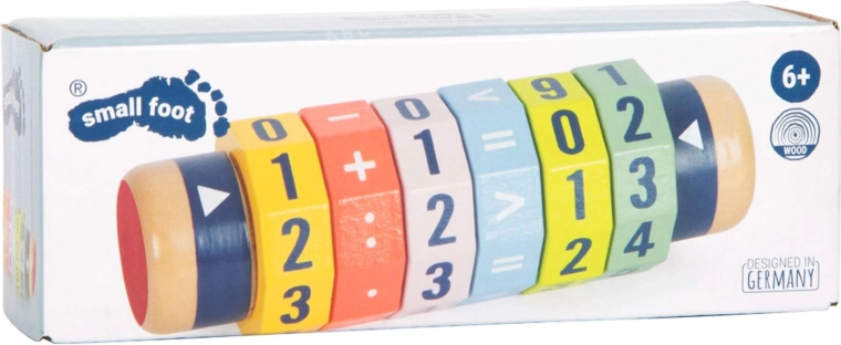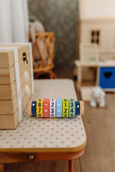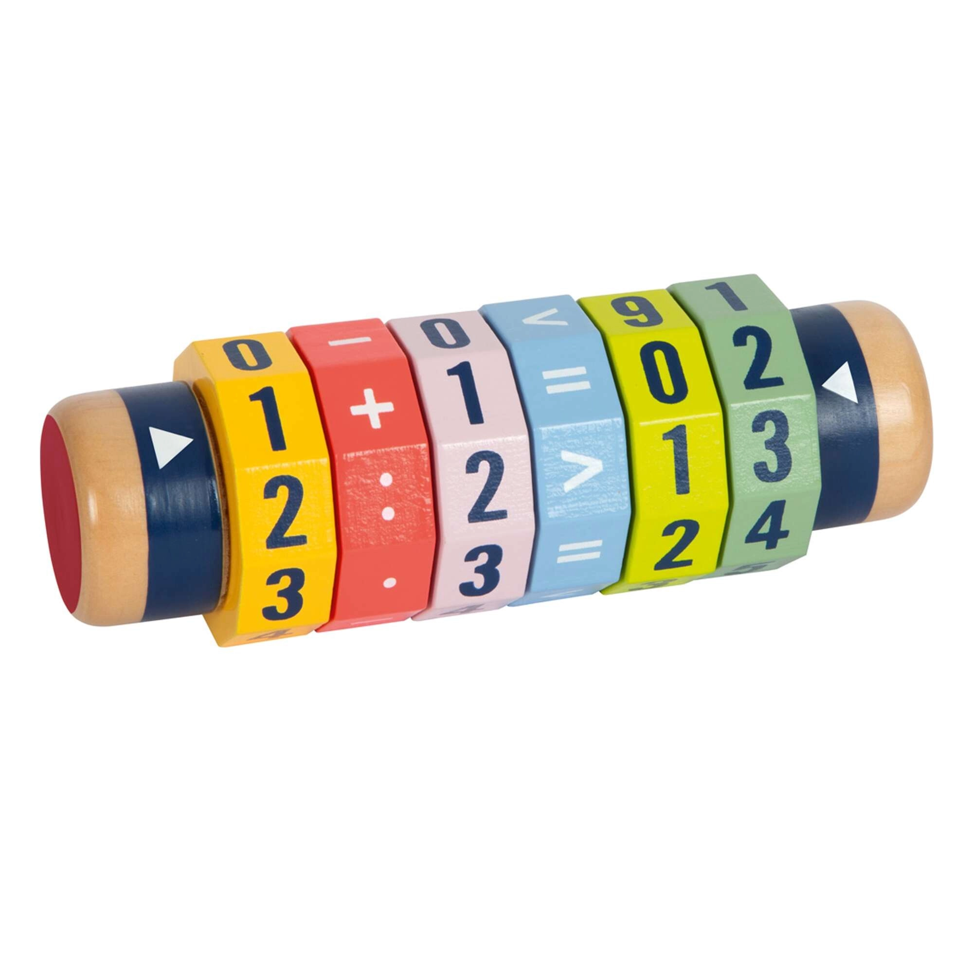 Opdag en sjov vej til matematik. Træcylinderen med seks roterende ringe gør det muligt for børn at skabe både simple og mere avancerede ligninger og tal-sammenligninger. Takket være de klare farver og de tydelige tal lærer børn gennem leg og styrker finmotorik samt koncentration.