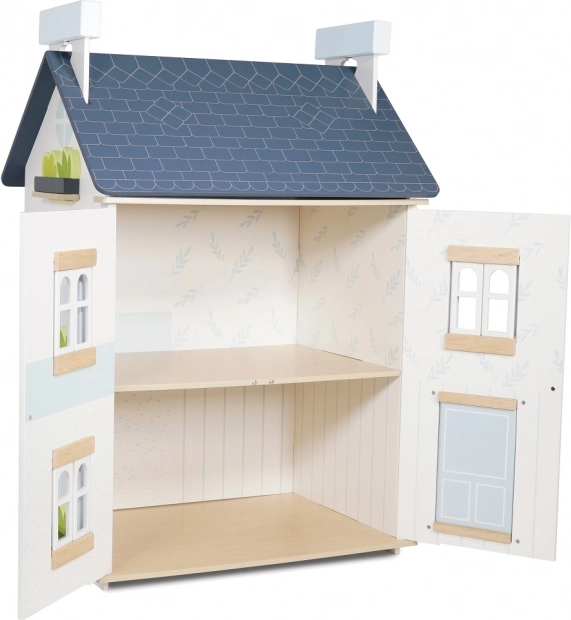Dukkehuset Sky fra Le Toy Van er fremstillet af højkvalitets træ med fokus på etiske produktionsmetoder. Det er malet i blid hvid og pastelblå, hvilket gør det til et dekorativt element i ethvert børneværelse. Åbne vinduer og den to-etagers konstruktion giver utallige muligheder for fantasifuld leg og udvikling af koordination og finmotorik.