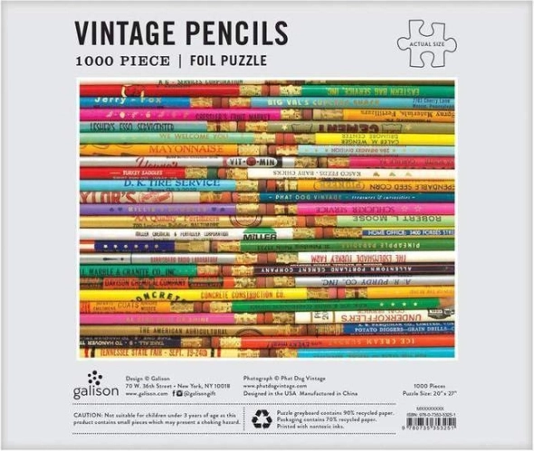 Nyd afslappende puslespilssjov med det stemningsfulde motiv af vintageblyanter indsamlet af studiet PHAT DOG VINTAGE på rejser. Hvert eneste detalje træder frem takket være omhyggeligt tryk, og udvalgte dele af kompositionen fremhæves af glinsende guldfolie-accenter, der giver et luksuriøst udtryk.