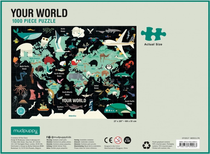 Oplev en verden af sjov med familiepuslespillet Mudpuppy “Din verden” med 1000 brikker. Premiumkvalitet, giftfri blæk og præcist passende brikker sikrer en fantastisk oplevelse for både børn og voksne. Ideelt til hyggestunder sammen og til at udvikle logisk tænkning og finmotorik.