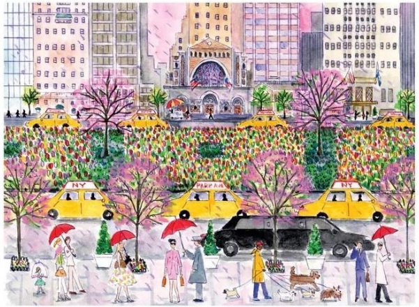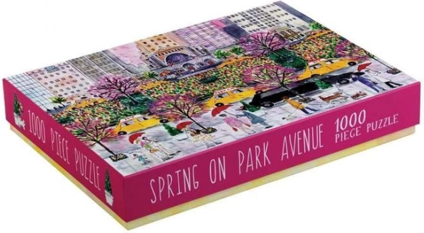 Fængende illustration af forårets Park Avenue med ikoniske gule taxier og blomstrende træer, som bringer New York-stemning til din puslespilsstund.