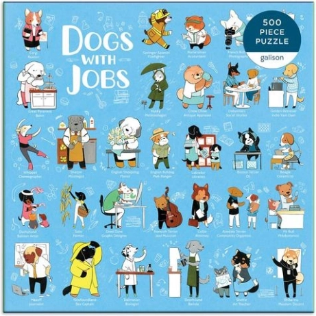 Familiepuslespil Galison Hunde på arbejde, 500 brikker. Premiumkvalitet, præcist pasformende brikker, ikke‑giftige blæk og genbrugspapir. Mål 50,8 × 50,8 cm.