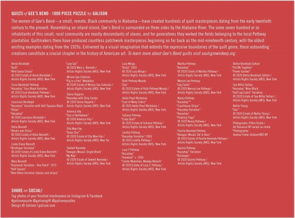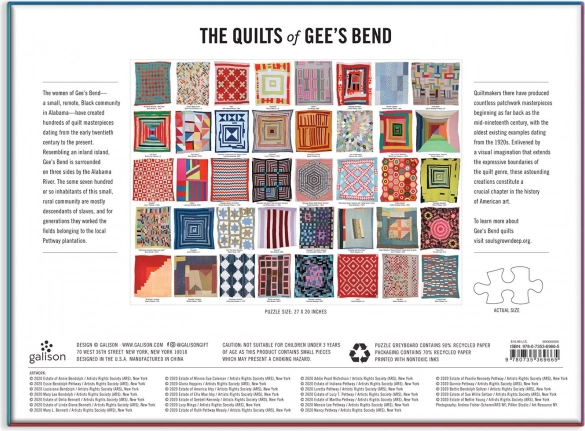 Dyk ned i en visuelt dragende kollektion af patchworkmønstre inspireret af kvindernes værker fra Gee’s Bend i Alabama. Dette puslespil med 1000 brikker kombinerer rige farver og geometriske motiver, som skaber et unikt billede med høj dekorativ værdi.
