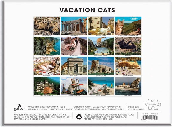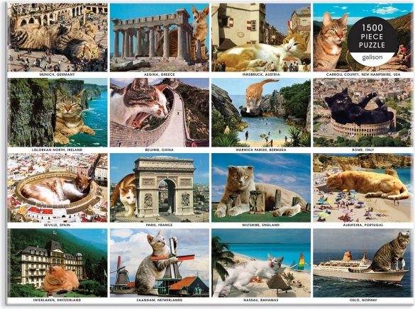 Humoristisk puslespil med katte på ferie bestående af 1500 brikker, der tilbyder underholdning og afslapning. Indeholder seksten realistiske fotografier, hvor du kan nyde katte, der beundrer kendte steder i verden.