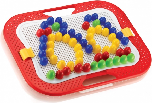 Dette kreative mozaik-sæt giver børn fra 3 år uendelige muligheder for at lægge billeder og mønstre. Store, lette at gribe knopper med glat, kuppelformet top sættes i hullerne på den robuste perforerede plade, som er indsat i en solid ramme med håndtag. Legen stimulerer fantasien, udvikler hånd-øje-koordination og styrker koncentrationen.