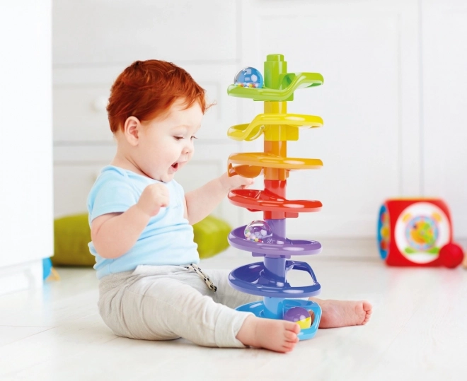 Spiral Tower indeholder store og farverige dele, der er sikre for små børn. Således kan de trygt lege og udvikle deres sensoriske opfattelse.