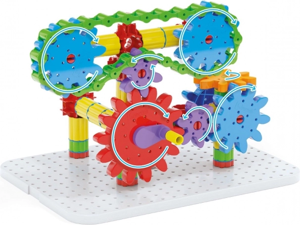 Byggesættet er lavet af holdbar plastik og er beregnet til børn fra 5 år. Det indeholder komponenter som en hvid grundplade, tandhjul i forskellige størrelser, kæde og meget mere, hvilket giver børn mulighed for at opdage en ny verden af mekaniske bevægelser.