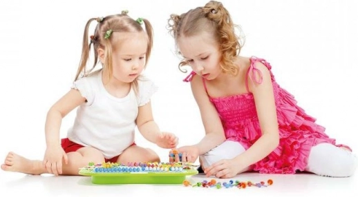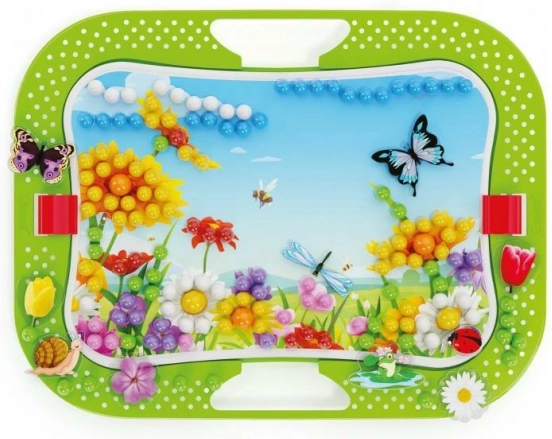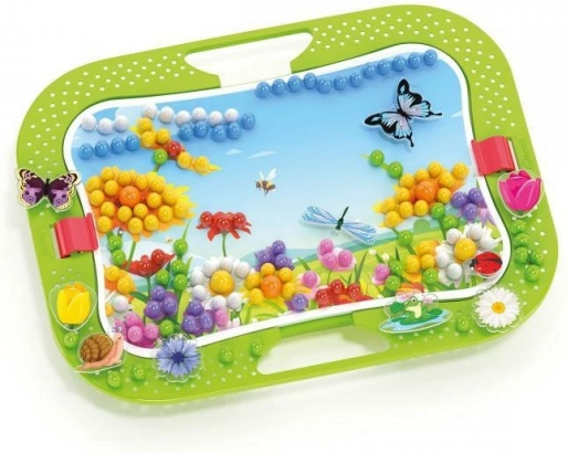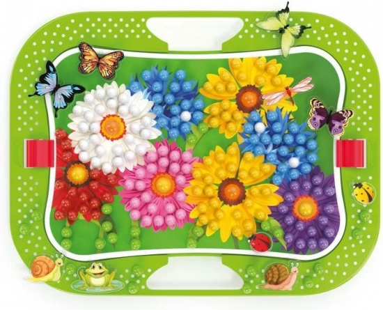 Skab din blomstrende have med knapper! De klassiske Quercetti-knapper i en farverig version, der repræsenterer naturens verden. Sættet indeholder knapper i forskellige farver og diametre, som du kan sætte i for at skabe forskellige landskabsscener, samt masser af klistermærker og figurer af sommerfugle, frøer, mariehøns og andre skabninger, så du kan befolke din naturlige verden. Indhold i pakken: 1 perforeret plade 28 × 20 cm, 2 mønsterbilleder, 300 knapper i 6 forskellige farver, 16 figurer, 1 sokkel med stativ, 1 træprikke-pen. Vigtige egenskaber: udvikler finmotorik, kreativitet og fantasi, indeholder 316 knapper, til børn fra 3 år