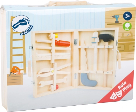 Giv børnene en autentisk oplevelse med værktøj med Small Foot Maik-kufferten. Alt er overskueligt opbevaret i en robust trækuffert med rebhåndtag. Hammer, sav og rørtang er sikret mod bevægelse, de øvrige dele sættes i udklappelige holdere, som nemt kan fjernes ved hjælp af store træskruer.