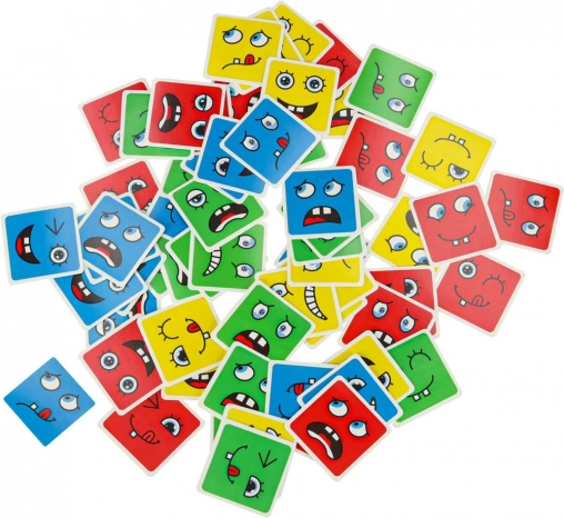 Et sjovt logikspil for både børn og voksne, der udvikler genkendelse af følelser, logisk tænkning og finmotorik. Vrid de farvede træklodser og saml det korrekte ansigtsudtryk efter kortenes opgaver – vinderen er den, der laver flest kombinationer på kortest tid. Sikkert trædesign, 64 kort med udtryk og 16 klodser i fire farver giver endeløs underholdning og læring.