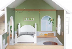 Dette moderne dukkehus byder på et åbent boligkoncept, hvor børn finder køkken med spiseplads, soveværelse, badeværelse og en stor terrasse med siddepladser. Den åbne front giver adgang fra forsiden og gør det nemt for flere børn at lege sammen. Den lyse facade og dæmpede farver passer flot ind i enhver indretning.