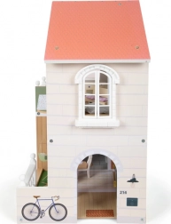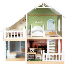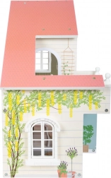 Stilfuldt trædukkehus med åben front, der tilbyder tre rum, terrasse og lille have for realistisk leg. Inkluderer spiraltrappe, åbnebare vinduer, moderne badeværelse med plexivæg og 8 stk. funktionelle møbler med tekstiltilbehør. Det kompakte og stabile design i lys, moderne stil passer perfekt i både børneværelse og stue.