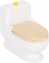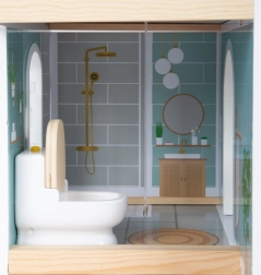 Stilfuldt badeværelse i stueetagen med brusevæg i plexiglas og åbnebar toilet for endnu mere autentisk leg.