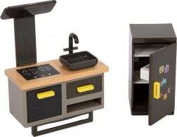 Pakken indeholder 8 stykker møbler og praktiske detaljer for autentisk leg: åbnebar toilet, køkkenskabe og køleskab med låger samt skuffer. Tekstilpuder og sengetøj giver soveværelset hygge, mens spiraltrappen forbinder de to etager med et gennemtænkt interiør og brusevæg i plexiglas.