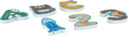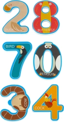 Farverige bogstaver og tal med søde dyr motiverer børn til at genkende og sætte deres første ord sammen samt øve tal direkte i badet.