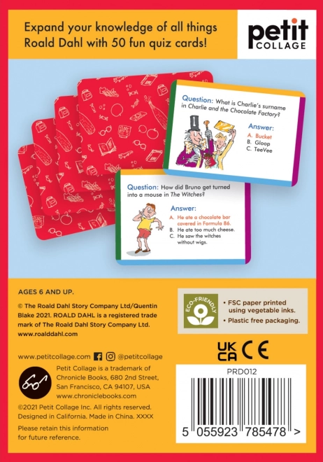 Bliv en mester i Roald Dahls historier med quizkortene, der udfordrer din hukommelse og viden. Kortene indeholder 50 spørgsmål, der vil give dig og din familie fremragende underholdning hjemme eller på farten. Med illustrationer af sir Quentin Blake er kortene også en fryd for øjet. Fremstillet af 100% FSC-certificeret papir og trykt med plantebaserede blæk, opfylder de strenge økologiske standarder.