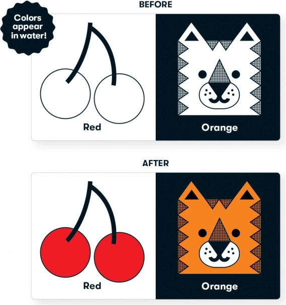 Den magiske badebog fra Mudpuppy forvandler hvert bad til en glædelig opdagelse. Dyp blot bogen i vand, og de sort-hvide illustrationer bliver til klart farvede billeder. Børn lærer på legende vis farverne og registrerer de forandringer, vandet medfører.