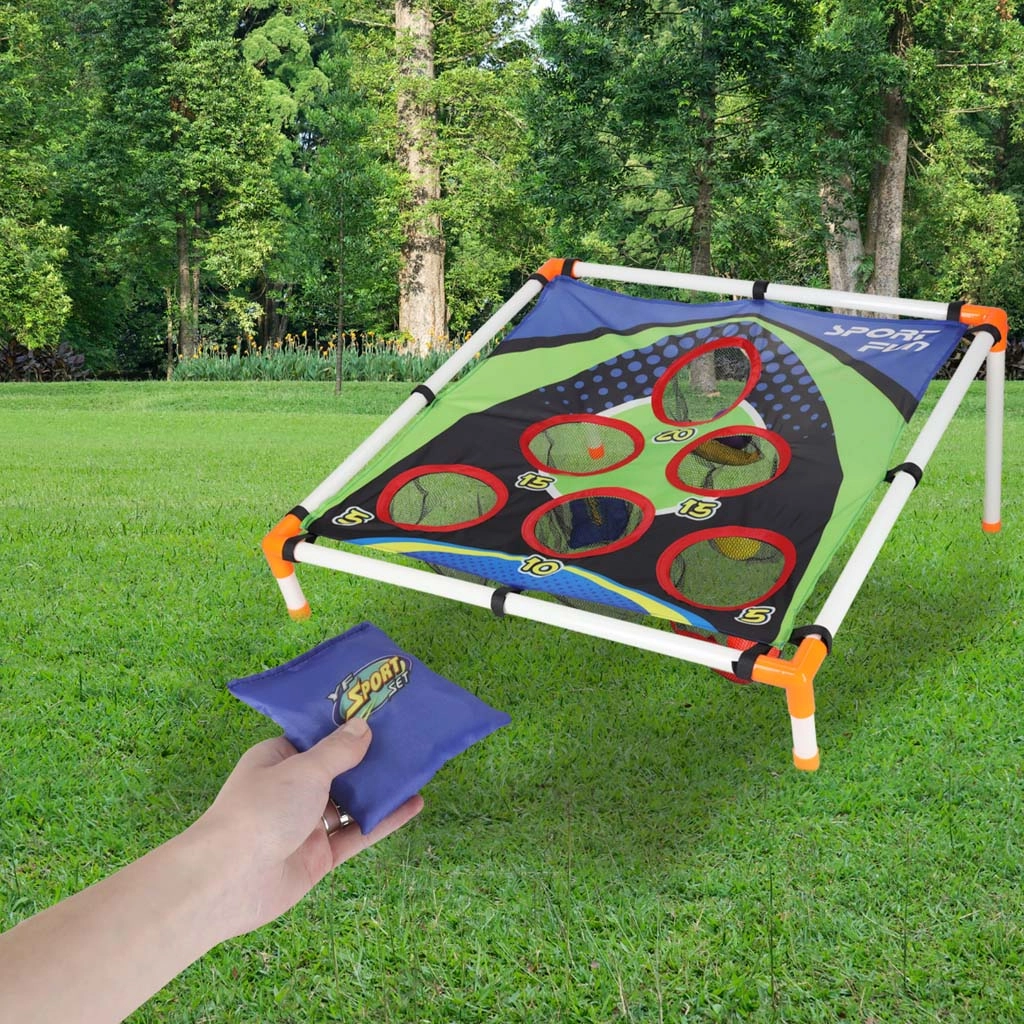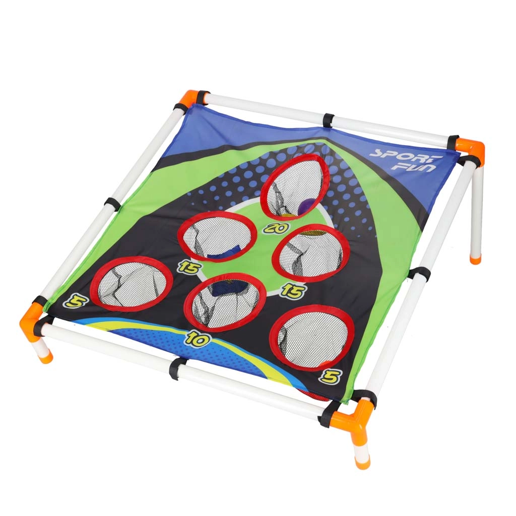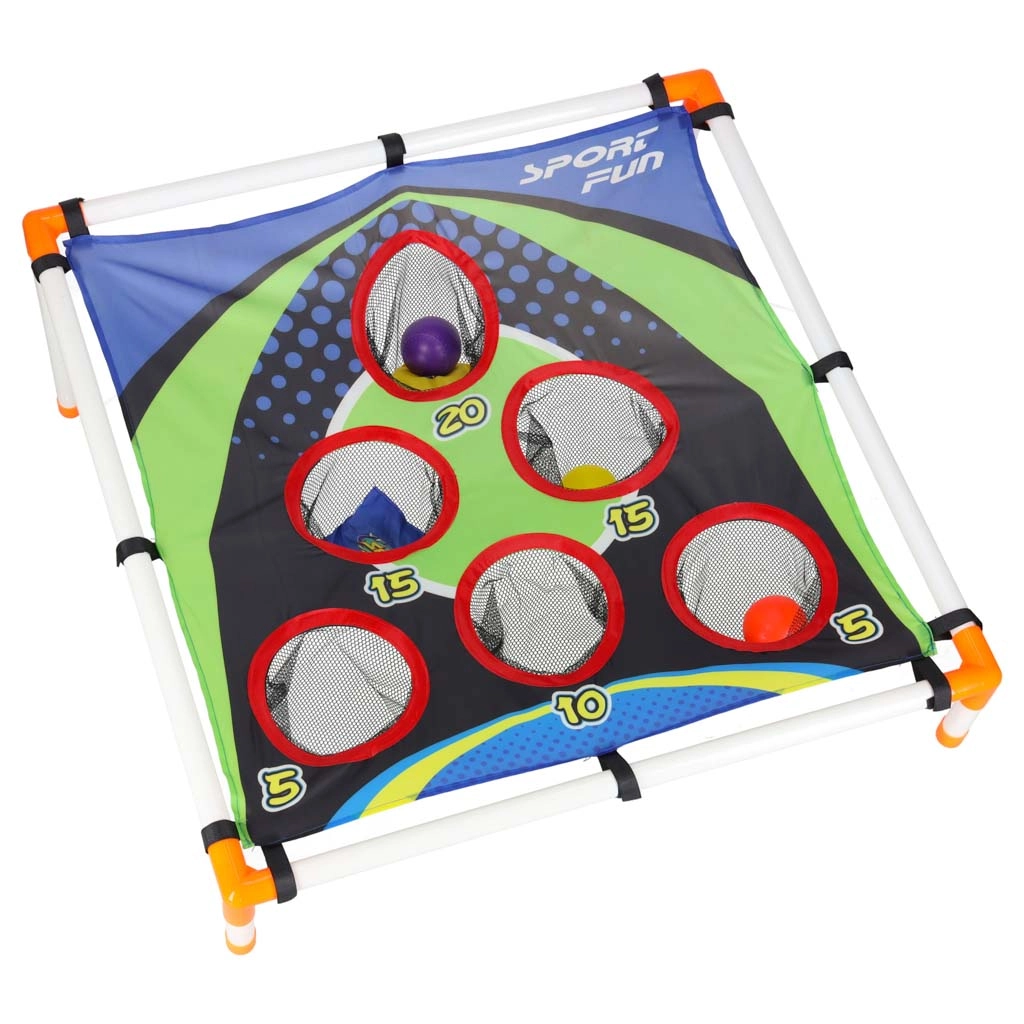Underholdende kastespil for børn, der udvikler hånd–øje-koordination, præcision og hurtige reaktioner. Den lette ramme med et skråt mål og nummererede huller giver forskellige pointudfordringer. Velegnet til have og indendørs, nem at samle og let at transportere. Inkluderer både ærteposer til kast og plastbolde.