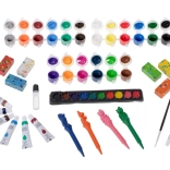 Sættet indeholder forskellige værktøjer som farveblyanter, markører, oliepasteller, maling og pensler, hvilket fremmer kreativ udfoldelse.