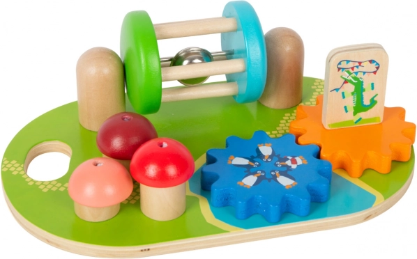 Den træplade byder på forskellige bevægelige elementer som tandhjul og knopper, der udvikler finmotorikken.