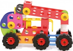 Skruer, møtrikker og perforerede plader forbindes let og holder godt. Børn kan bygge biler, traktorer, kraner og egne modeller – enkelt og sikkert.