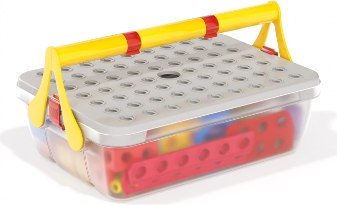 Alle dele kan opbevares i den solide boks med bærehåndtag. Det perforerede låg fungerer som byggeplade – ideelt både hjemme og på farten.