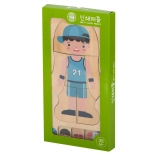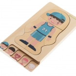 Sættet inkluderer en træbase og 28 separate brikker, der går fra skelet til karakterens påklædning. Ved hjælp af det enkle design og naturlige materialer understøtter puslespillet Montessoris metodik, der fokuserer på barnets holistiske læring.