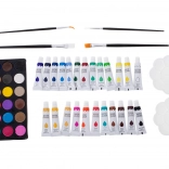 Palette med 24 akvarelfarver, 24 tubefarver, pensler og to plastikpaletter – komplet udstyr til både transparente og dækkende teknikker.