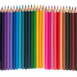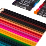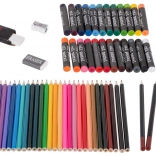 Farveblyanter, oliepasteller, blyanter, viskelæder og blyantspidser til præcis tegning, skyggevirkninger og markante farveflader.