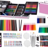 Dette alsidige sæt rummer op til 145 dele, så du kan skabe billeder med mange teknikker: tegning med blyant og farveblyanter, maling med akvarel og dækkende tubefarver, farverige illustrationer med tuscher eller arbejde med oliepasteller. Alt er overskueligt organiseret i en robust kuffert med låse og håndtag, så du nemt kan tage udstyret med overalt.