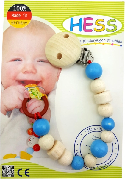 En praktisk suttekæde i en blid lyseblå farve, som holder sutten inden for rækkevidde og ren. Den har en metalclips til sikker fastgørelse på tøjet og en universel silikone-ring til at passe de fleste sutter. Fremstillet i Tyskland af kvalitetstræ med ugiftige farver, der er modstandsdygtige over for spyt og sved.