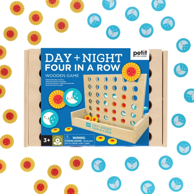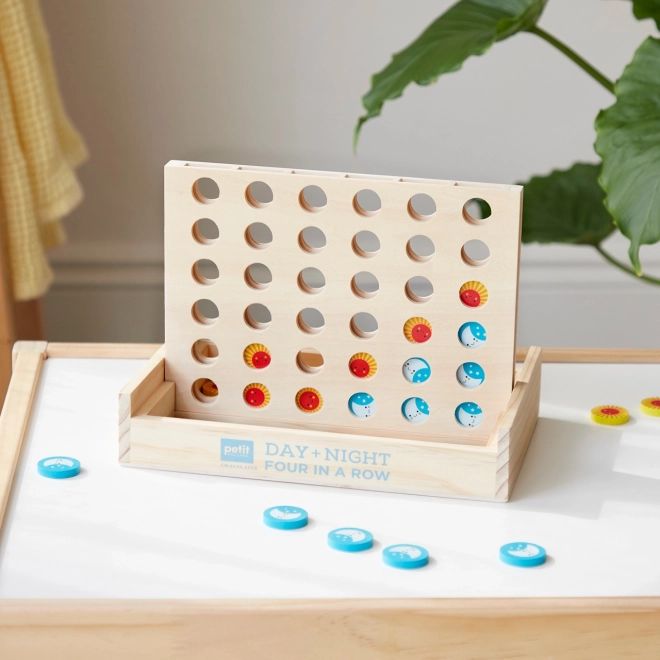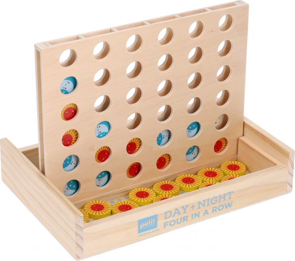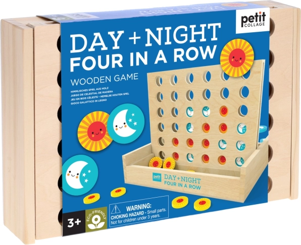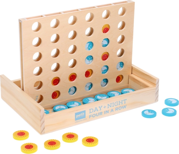 Træspillet Fire på Stribe Dag og Nat kræver ikke kun hurtig tænkning fra spillerne, men også evnen til strategisk planlægning. Målet er at placere fire brikker på stribe på gitteret. Brikkerne har et attraktivt sol- og måne design, som vil fange og glæde både små og store spillere.
