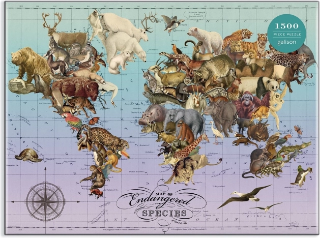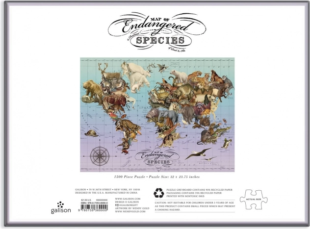 1500-brikkers puslespil med motiv af truede arter af Wendy Gold, mål 813x603 mm, egnet til børn fra 8 år.