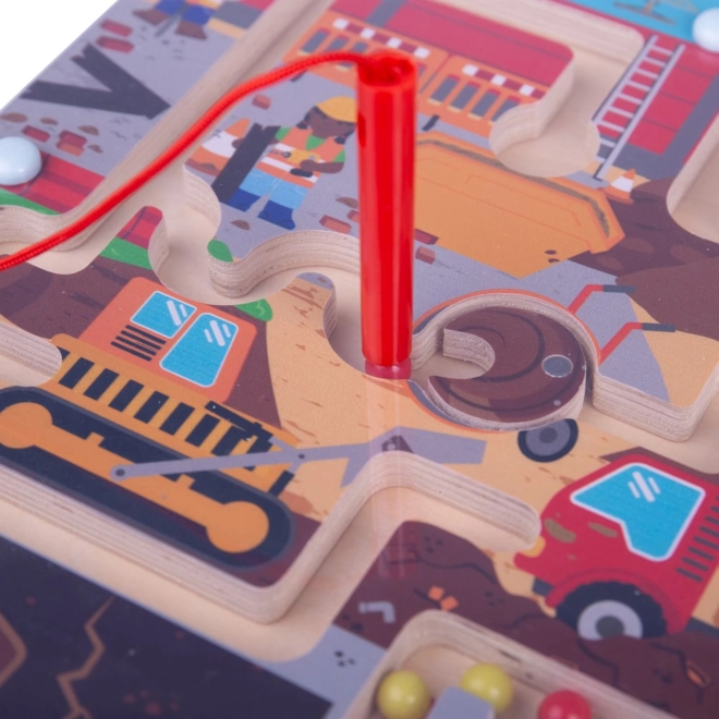 Denne kvalitets magnetiske træ-labyrint med byggepladstema glæder børn fra 3 år. Med den medfølgende magnetiske peger flytter børn farvede kugler mellem gravemaskiner, lastbiler og forhindringer, træner logik og rumlig forståelse og har det samtidig rigtig sjovt.