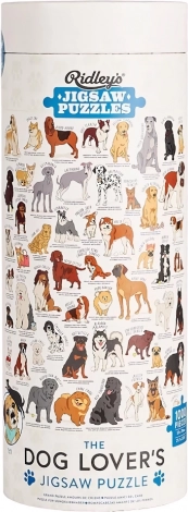 Puslespil med 1000 brikker for hundeelskere fra Ridley’s Games. Håndillustrerede racer, eksklusiv blank overflade.