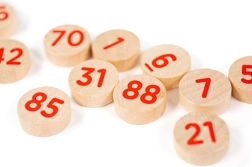 Brikkerne er lavet af naturligt træ og markeret med tydelige røde tal for let aflæsning.