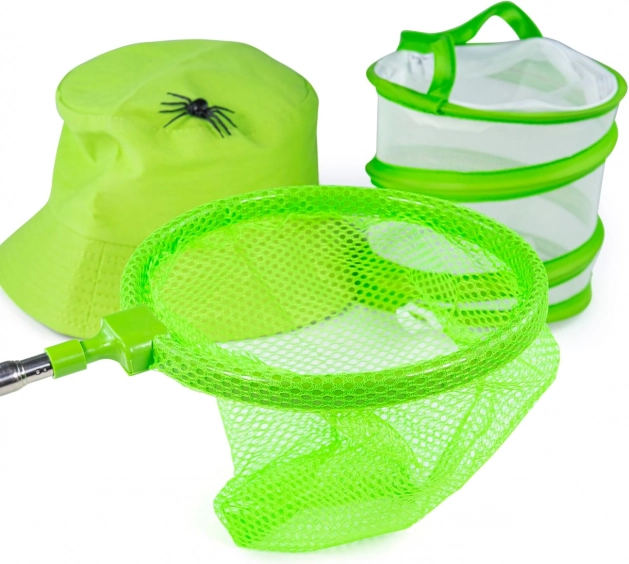 Forvandl hver gåtur til et eventyr med dette komplette insektfangstsæt til små opdagere. Det indeholder et fangstnet med teleskopisk skaft, en fangstbeholder, en lup, en fangstpincet, en kikkert og en praktisk solhat. Takket være den sammenklappelige netpose er det let, kompakt og ideelt til ture. Fremstillet af holdbare materialer, egnet fra 3 år.