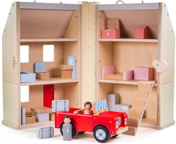 Dette omhyggeligt udarbejdede, sammenklappelige dukkehus åbner for en charmerende miniatureverden, hvor børn kan skabe deres egne historier og udvikle fantasi, sociale færdigheder og finmotorik. Indretningen kan let ændres – møblerne kan flyttes frit, og figurerne sættes i forskellige situationer, inklusive køreture i den medfølgende lille bil.