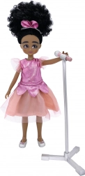 Dukken er udstyret med en hvid pels, lyserød nederdel og en mikrofon med stativ, som perfekt supplerer hendes stjernedragt.