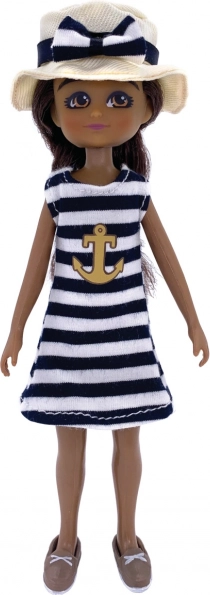 En dukke med en nautisk-inspireret kjole og matchende tilbehør, klar til sommerens eventyr.