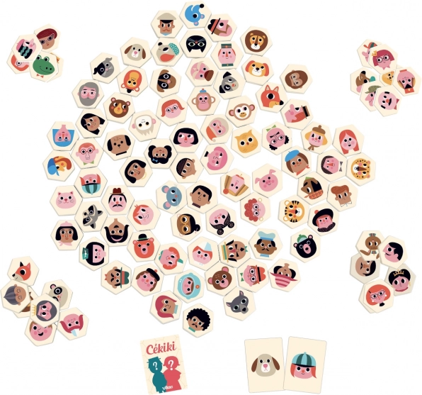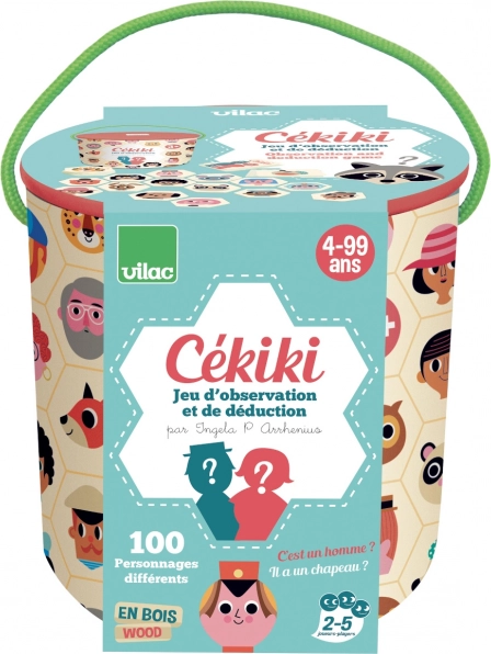 VILAC CÉKIKI er et hurtigt iagttagelses- og gættespil med originale figurer af den svenske illustrator Ingela P. Arrhenius. Læg træbrikkerne med billeder på bordet, og prøv to måder at spille på: Enten gætter I den hemmelige figur ved hjælp af smarte ja/nej-spørgsmål, eller også finder I lynhurtigt det billede, der matcher det vendte kort.