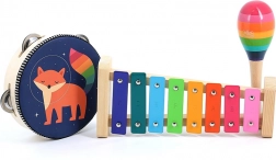 Sættet indeholder xylofon, tamburin, triangel og maracas, hvilket gør det til et fremragende læringsværktøj til at udvikle børns musikalske færdigheder og rytmesans.