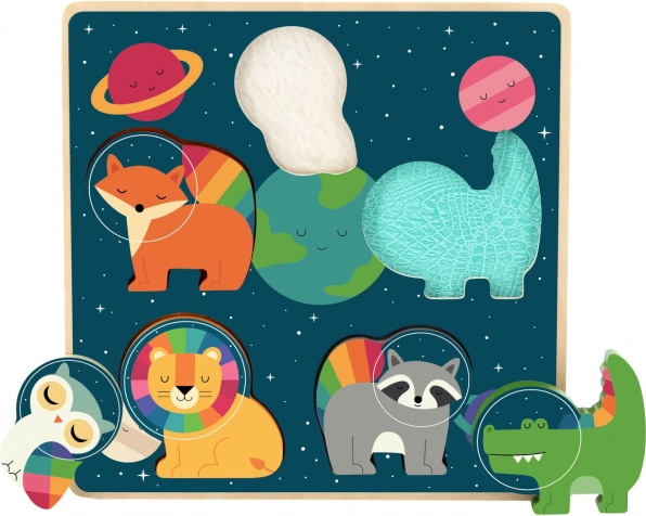 Opdag det farverige univers med dyre-astronauter af Andy Westface. Dette puttepuslespil hjælper børn med at udvikle formgenkendelse, finmotorik og berøringssans gennem forskellige taktile teksturer.