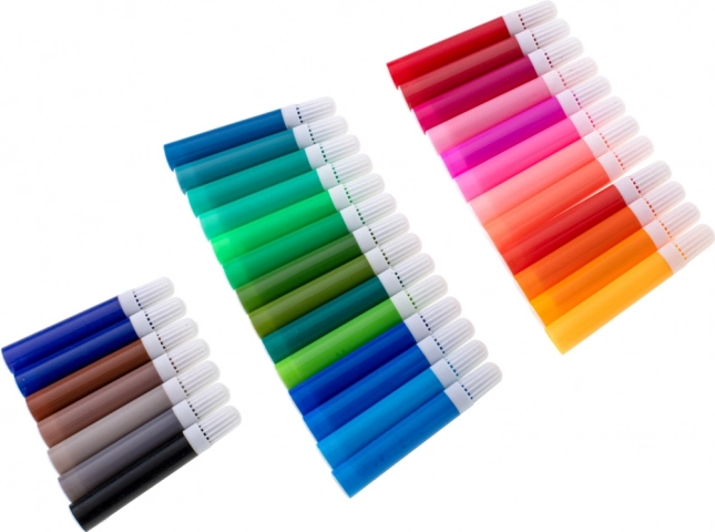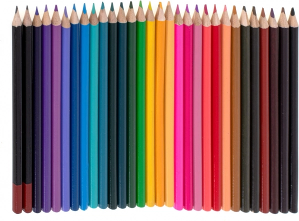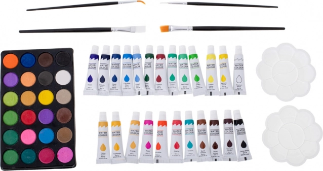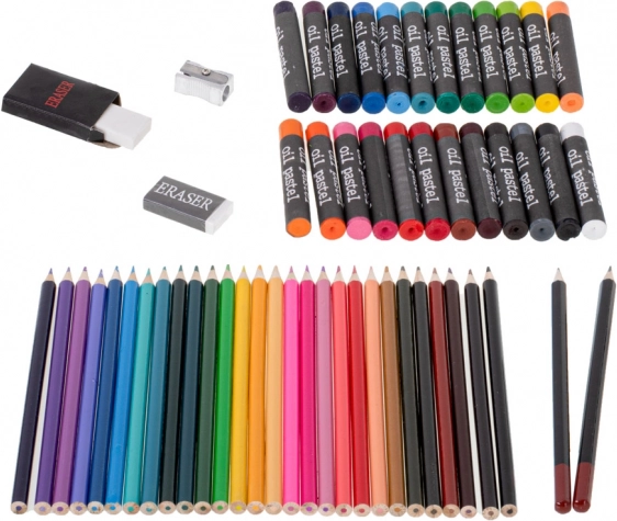 - 33× tusch, 28× farveblyant, 4× pensel, 2× blyant, 2× viskelæder, 2× plastpalette, 1× blyantspidser, palette med 24 akvarelfarver, 24× farve i tube, 24× oliepastel, kuffert